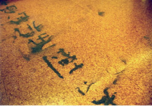 漢字はそもそも青銅時代の中国で甲骨文字として誕生し、限られた神官が神と交信するための秘密の道具だったのだが、その後王たちの権威を示すかのように岩に縦長に彫られたりしたように、ニーズに合わせて様々な書体が生まれた。時代は下って、個人の筆跡がその人となりを表わすと認められるようになって、漢字はやっと神の領域から個人の領域へと降りてきたのだといえる。ところが「我我の家郷迄来て見ることができますか?」では、筆跡はぼくのものではなく、個人に属するというよりも間に漂い、また上下も逆さまになったまま、まだ相手に向けて届けられていないし、王たちの碑文のように堅牢ではなく、観客に蹴られたりまき散らされたりして心もとないが、ぼくはこんな刹那のうつろいの中に、むしろ送り手と受け手の注意がコミュニケーションに向けて初動する瞬間のハッとさせる強さを感じてしまうのだ。
