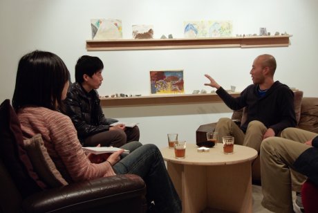 4客の中古のソファは、漢字の<心>の4つの点を象徴し、一見バラバラなソファやクッションの色は、ビョルンの絵に対応するよう注意深く選ばれている。ストーリーテリングのゲストは、<心>の中に、ビョルンの絵の中に実際に座ることによって、ぼくの個人的なストーリーにコミットすることが期待されている。
